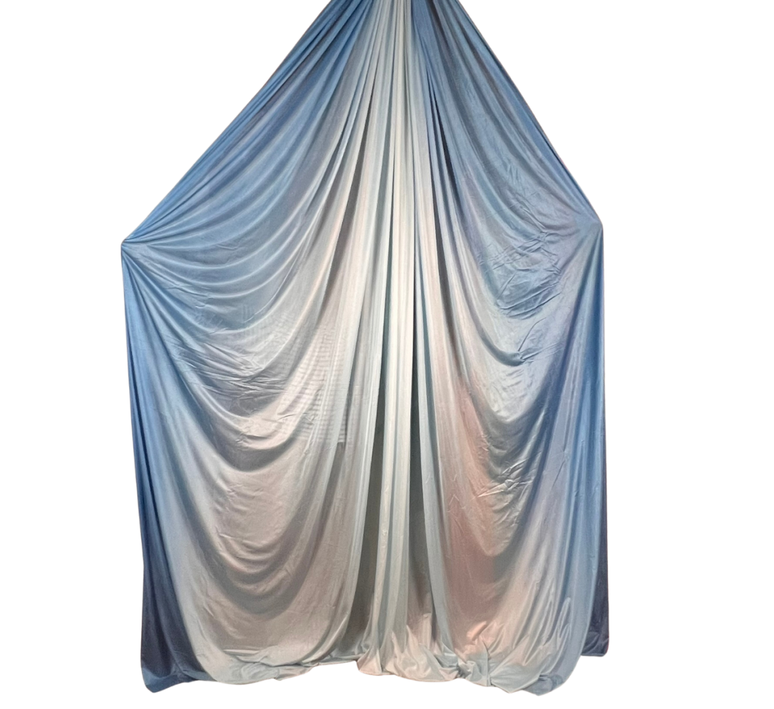 Made from 100% polyester, this fabric provides the perfect balance of strength, softness, and control. It has a gentle stretch along its length, ensuring excellent stability during climbs, spins, and drops. The subtle sheen and elegant blue-white ombre gradient add a professional and graceful stage presence