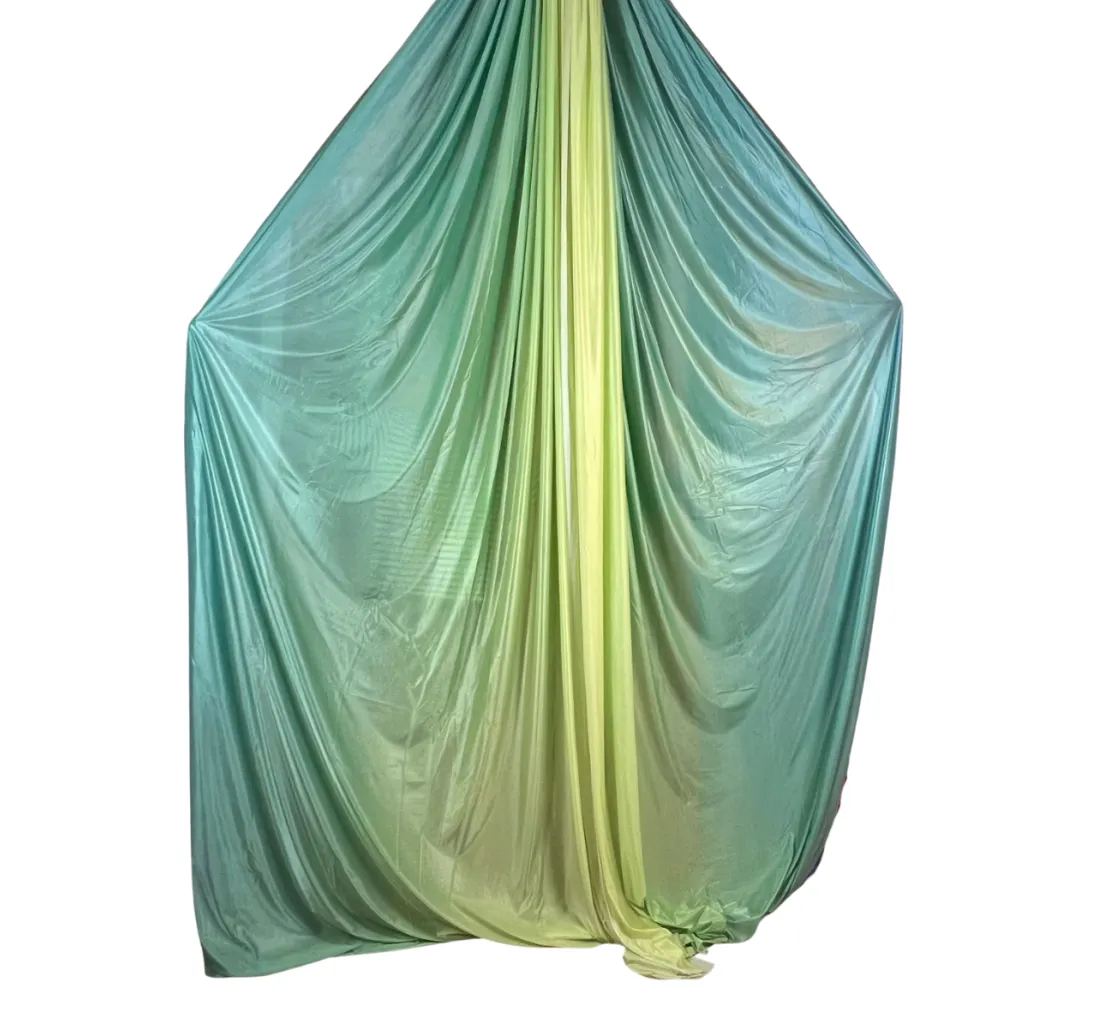 Made from 100% polyester, the fabric provides an ideal combination of strength, softness, and control. Its minimal stretch along the length ensures excellent stability for climbs, spins, and drops. The subtle sheen and vibrant green-to-yellow gradient add elegance and flair to any stage or studio performance